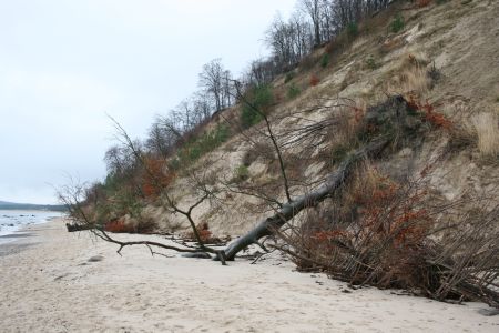 Und wieder hat sich das Steilufer verändert: Dieser Abbruch zwischen Baabe und Sellin ist ein ganz natürlicher Vorgang – Wo das Cliff nicht befestigt ist, unterspült das Meer das Hochufer. Sand rutscht ab und selbst die größten Buchen am Hang verlieren den Halt und folgen. Immer wieder treten Tonschichten zutage. Um der Erosion am Hauptstrand (auf Höhe der Seebrücke) Einhalt zu gebieten, ist dort das Hochufer mit Steinanlagen befestigt.